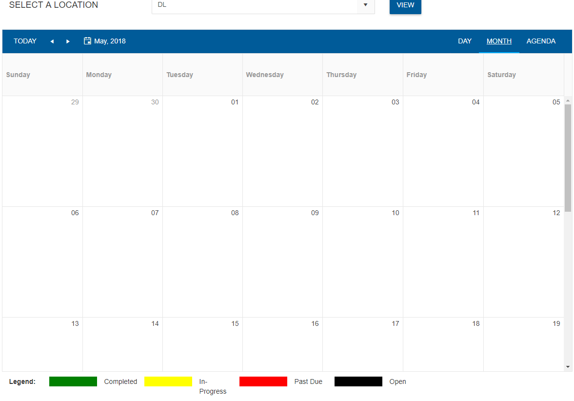 The calendar icon in the navigation bar at the top of the page will bring a user to the "Calendar" page above. The user can then select a location from the drop down menu and then press the "VIEW" button to load up all the work orders in that location. The user can switch the view by clicking on the "DAY", "MONTH", or "AGENDA" buttons. Depending on the view the user is in, if the user clicks on the "<" or ">" arrows, they can switch between days or months. The "Agenda" view will show everything that will be scheduled that day. For information on the legend, see the Legend page.