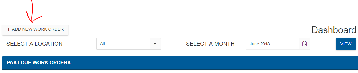 After a successful login, the user will be directed to a Dashboard view. This page can be useful to add a new work order, looking at work orders in a certain location and/or month, and looking, at "Past Due Work Orders" or "Scheduled Work Orders." By clicking the "+ADD NEW WORK ORDER" button on the top left of the page, the user will be redirected to a "Create Work Order" page.