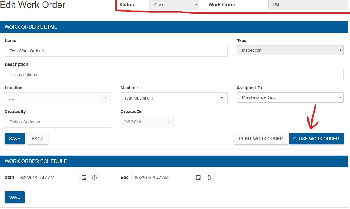 On the top of this Page, the user can see that the "Work Order" status is open. The user will also be able to see the "Work Order Id" in the text box at the top right of the page. In the "WORK ORDER DETAIL" section, the user is allowed to change the name, description, machine, and who the work order is assigned to. The user is not allowed to change the type, location, the created by, or the created on date. By clicking the "PRINT WORK ORDER" button, a new window should open up allowing the user to print the work order. If the "SAVE" button is pressed, the user will be redirected back to the dashboard page and the work order should show up on one of the grids, dependent on the date. In the "WORK ORDER SCHEDULE" section, the user will be allowed to set the start date and time, as well as the end date and time. The "SAVE" button in this section will also bring the user back to the dashboard page.