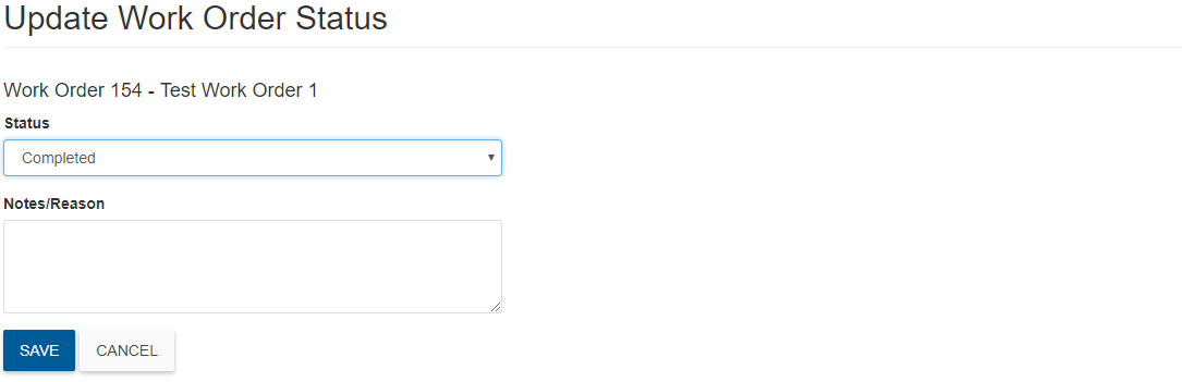 On this page, the work order id and work order name will be shown above the "status." A "status" drop down menu will be present with the values of "Open", "Approved", "Scheduled", "In-Progress", "Completed", "Closed", and "Cancelled." Changing the status of a work order here will change the picture it has on the dashboard. "Completed" work orders will not be shown on the dashboard page. The user will also be able to add text to the "Notes/Reasons". The "SAVE" button will take the user back to the dashboard page.