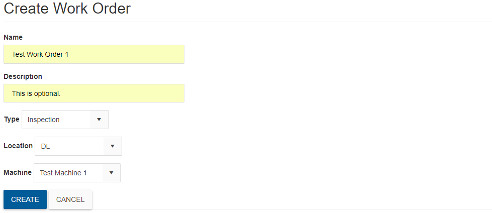 On this page, the user needs to enter a "Name", "Description"(optional), "Type", "Location", and a "Machine." If the "Machine" value is null, the create button will not work and an error message will be shown: "The value is invalid." After all valid info is entered, press the "create" button.