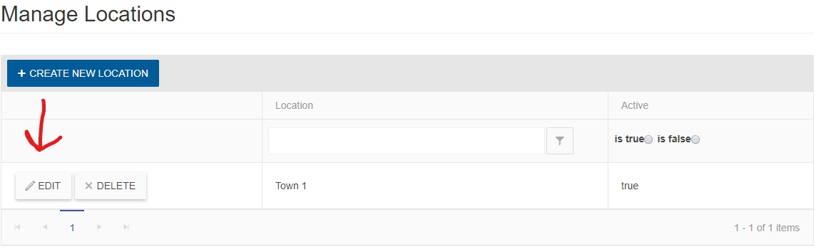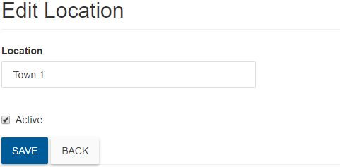 This allows the user to change the name of a location, and make the location "active" or not. To create a new location, click the "CREATE NEW LOCATION" button. Clicking this button will bring you to a new page with the title "Create Location."
