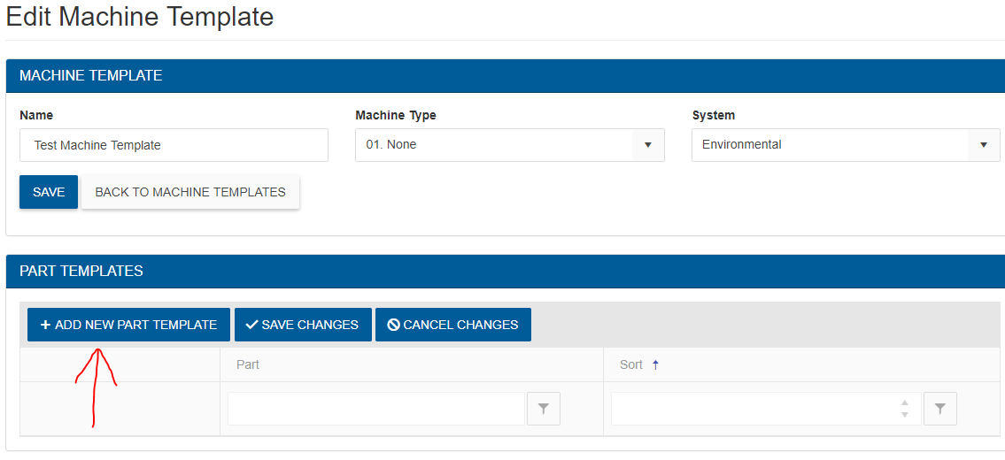 From here, the user clicks on "ADD NEW PART TEMPLATE" button. The user can add as many part templates as desired. Pressing the "SAVE" button will save all of the information. If the user clicks on the "CANCEL CHANGES" button before the information is saved, none of the new information will be saved. In order to add a part templates to a machine template, the user must first go under the part template drop down and create a part template. Then the user can add a part template to a machine template.