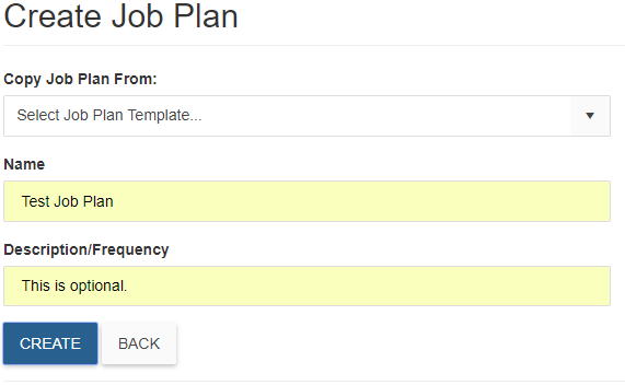 The "Job Plan" section is next. A user can add as many job plans as they desire. To add a new job plan, click on the "ADD NEW JOB PLAN" button. This will redirect the user to the "Create Job Plan" page. On this page you can select a job plan template that would have to have been created by the user already. Otherwise you can just add the name the user wants and fill in the Description/Frequency text box as seen below on the left. After the user clicks the "CREATE" button, the user will be directed to the page below on the right. As you can see, The first section of this page contains the information that was just entered into the page before. The "SAVE" and "BACK TO MACHINE" buttons work exactly like the previous buttons earlier on this page.