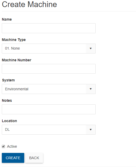 On this page, The user will be allowed to enter a name for the machine, select a machine type that the user would have to have been put into the system already, enter a machine number, select a system that would have to have been put into the system already, enter notes, select a location, and finally check the "Active" check box to tell the system if the machine is being used or not. The "Back" button will take the user back to the Machines view page.