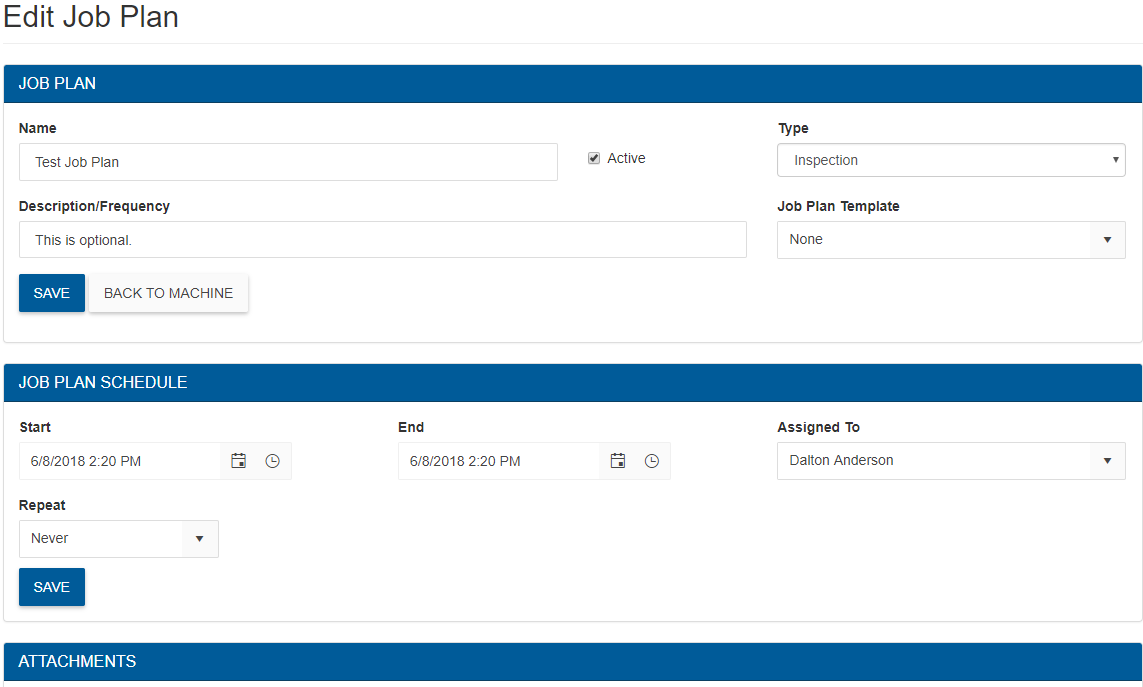 From this page the user can select a job plan template that was just created and use it on this machine. The user can fill out the remaining information and then press the "CREATE" button. This will bring you to the Edit Job Plan view page. This page information can be found under the machines link. The user can change the job plan schedule, add attachments, and add questions to this job plan. The job plan templates that the user created and applied to this machine will automatically bring in the attachments and questions to this job plan. The user can still add more attachments and questions to the job plan. If the user were to update or modify the job plan template, any machine job plan that use that job plan template will automatically be updated as well.
