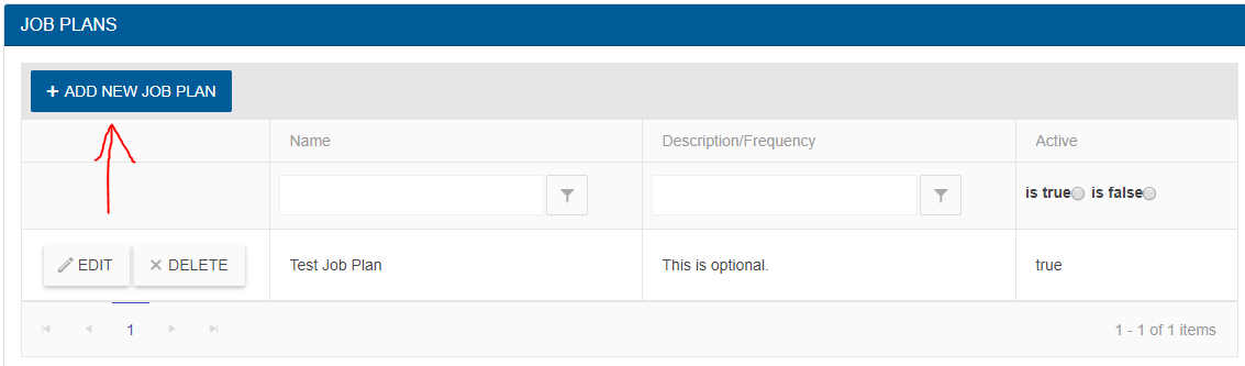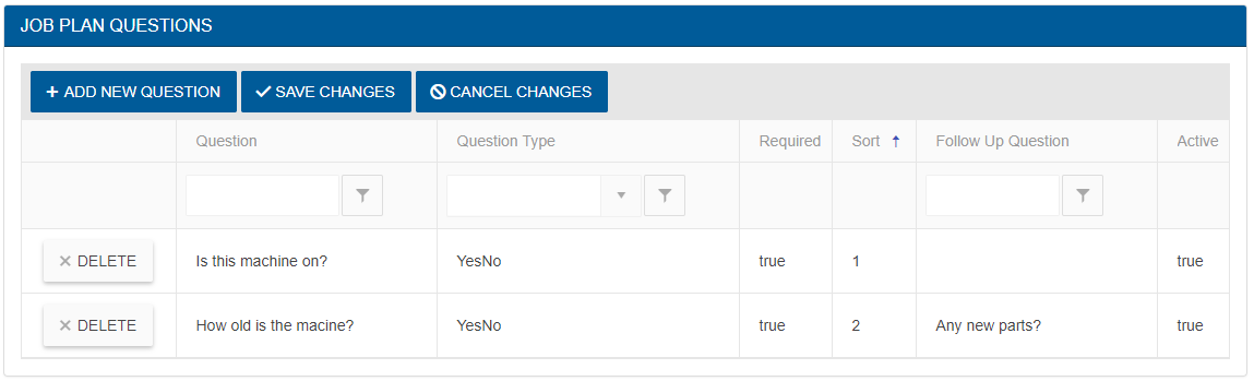 The image above shows the last section on the "Edit Job Plan" page. In this section the user can add job plan questions to a job plan that is for a machine. To add a new questions, first click the"ADD NEW QUESTION" button. Enter the question in the question column. Next the user has to select the question type which includes "YesNo" ,"Textbox", "Text", "Header". The required column will default to true. The sort will automatically be set to the next number, but the user can change it to any number. The next column is a follow up question that the user can enter. This column does not need to have a value in it, it is optional. The active column will default to true. If the user makes the questions not active, the question will not show up when doing the job plan. Scroll back up to the top of the page and press the "SAVE" button which will bring you back to the "Edit Machine" page.