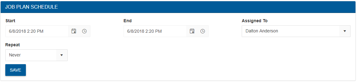 The above picture is the next section on the "Edit Job Plan" page. In this section the user can change the start date and time by pressing on the calendar or clock icon. The user can also do the same thing for the end date and end time. The next thing the user can do is decide who they want to assign this job plan to. That choice will be up to the user creating the job plan. The last thing in this section is to set if the user would like this job plan to have a repeat. When the user clicks on the drop down menu, choices of "never", "Daily", "Weekly", "Monthly", and "Yearly" show up.