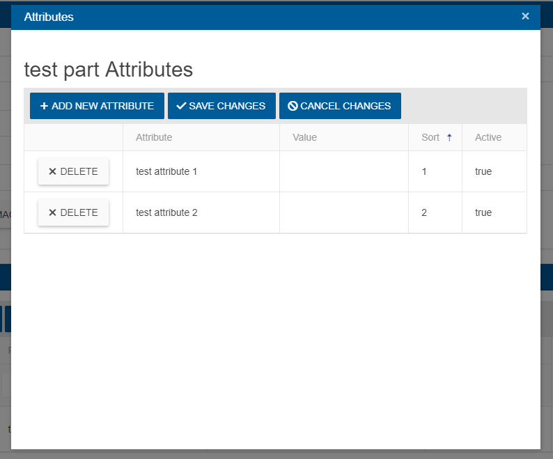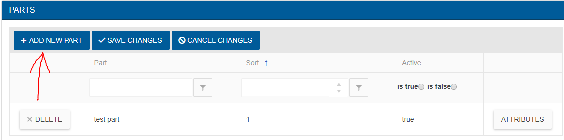 Now we move onto the "Parts" section of this page. This section has three buttons at the top; "ADD NEW PART", "SAVE CHANGES", and "CANCEL CHANGES." When you click "ADD NEW PART", a row will be created where you can enter a "Part". A "Sort" number will be automatically given. A user can change the "Sort" number to any number a user wants. The column "Active" will also be automatically set to true, but the user can easily switch it to false. In order to get the the newly added part to stay in the "Parts" section grid, the user needs to press the "SAVE" button. A user can add as many parts at one time as they want. The "SAVE" button can save more than one part at a time. The "CANCEL CHANGES" button will get rid of any rows that were added that have not been saved.