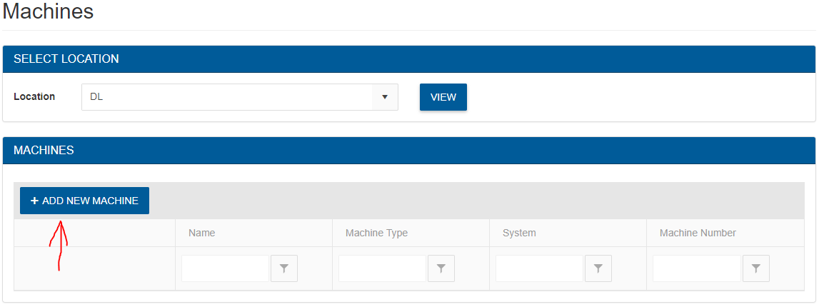 The "locations" drop down menu will let the user select a location in the system. If the "VIEW" button is clicked, it will only show the machines in that selected location. To add a new machine, click the "+ADD NEW MACHINE" button. Clicking this button will redirect the user to a "Create Machine" page.
