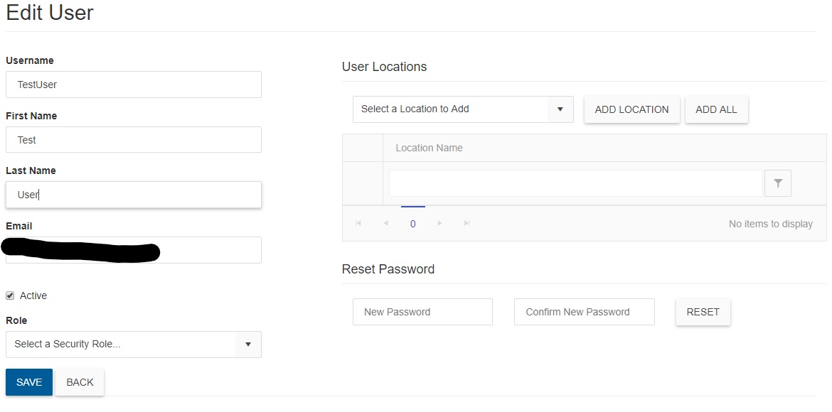On the Edit User view page, the user can change the username, firstname, lastname, and email address of any user. The user can also select a security role for the user being edited. Certain roles allows a user access to do certain things or see certain things on Simon. The user can also assign the user being edited a location(s) which will let that user only see information assigned to that location. This page also lets the user reset the password for the account. Press the "Save" button and then return to the Manage Users view page where you will see the new user listed.