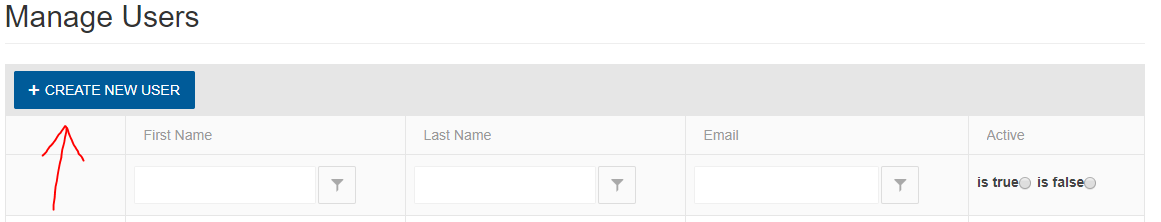 The User drop down will bring the user to a Manage User view page. Only users with a "Corporate" role can create or edit users. To create a new user click on the "CREATE NEW USER" button. This will bring the user to a Create User view page. The user will then enter a username, firstname, lastname, email address, and password for the new user. The password for a user must meet certain criteria.